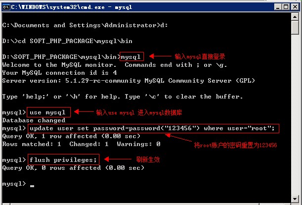 mysql>?update user set password=password(“123456″) where user=”root”;