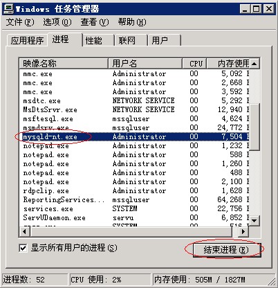 3、關閉兩個命令窗口,此時還無法啟動mysql因為mysql進程還在運行中,打開任務管理器,找到mysqld開頭的進程,點結束進程,如圖: