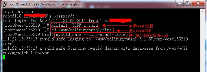 2、?使用`–skip-grant-tables’?參數(shù)來啟動?mysqld(/www/wdlinux/mysql/bin/為wdcp系統(tǒng)的mysql路徑,非此系統(tǒng)的,請變更mysql的路徑)。