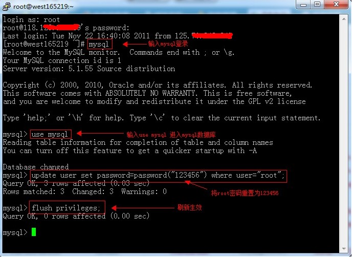 >update user set password=password(“123456″)??where user=”root”;