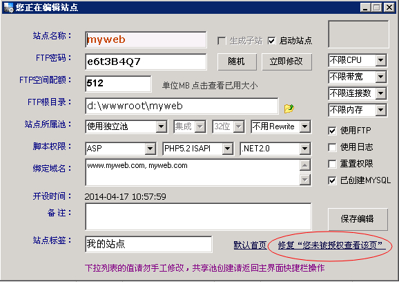 站點(diǎn)名稱:填寫一個FTP賬號,可以是英文(建議小寫)和數(shù)字的組合 FTP密碼:建議保持默認(rèn)或自己設(shè)定一個容易記住但比較復(fù)雜的密碼,切勿用FTP賬號做密碼。 FTP空間配額:建議保持默認(rèn)設(shè)置 FTP個目錄:建議保持默認(rèn)設(shè)置 站點(diǎn)所屬池:建議保持默認(rèn)設(shè)置 腳本權(quán)限:如果是asp程序,請將php_isapi修改為“無”; 如果是PHP程序,請將ASP修改為“無”; 如果是ASP.NET程序,請將ASP修改為“無”,請將PHP_ISAPI修改為“無”,請將“不使用asp.net”修改為 您需要的版本,如asp.net2.0 。 如果您對腳本權(quán)限概念不熟悉,請保持默認(rèn)設(shè)置。 偽靜態(tài)組件:PHP程序請在下拉菜單選擇對應(yīng)規(guī)則,如果沒有找到對應(yīng)的,請選擇自定義,保存配置后進(jìn)入您站點(diǎn)的 others目錄下,修改httpd.conf中的規(guī)則即可。ASP和ASP.NET程序建議保持默認(rèn)設(shè)置(不使用)