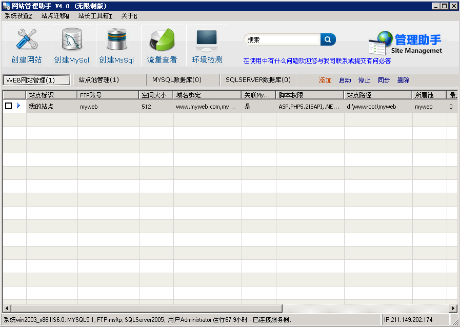最后點(diǎn)“確認(rèn)創(chuàng)建”就新建完一個站點(diǎn)了。 提示框提示“MYSQL創(chuàng)建結(jié)果:Ture”表示mysql創(chuàng)建成功,若mysql創(chuàng)建失敗,請檢查mysql服務(wù)是否正常啟動或系統(tǒng) 設(shè)置中mysql的路徑是否正確。