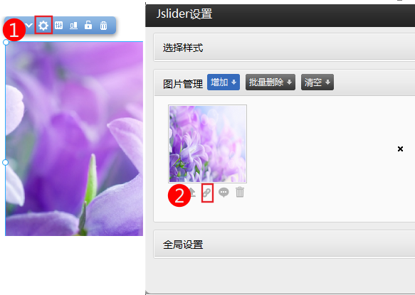 說明如上 4、 插件中的圖片添加link(以jslider幻燈展示為例) 添加了jslider幻燈展示后,逐張?zhí)砑訄D片,圖片添加完,點(diǎn)擊“圖片管理”右邊的“+”號打開圖片管理功能,如下圖: