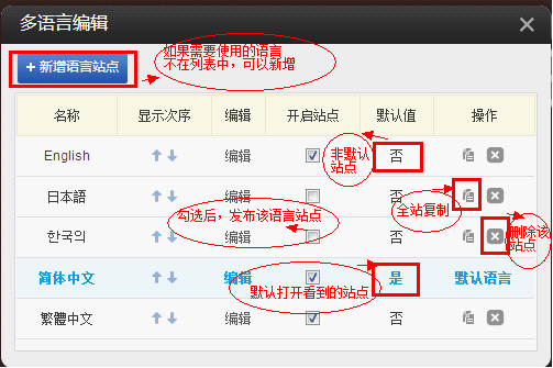 4. 如何設(shè)置多語(yǔ)言站點(diǎn)、默認(rèn)站點(diǎn)、顯示站點(diǎn)和復(fù)制站點(diǎn)內(nèi)容? 點(diǎn)擊多語(yǔ)言模塊菜單第3個(gè)按鈕進(jìn)入“多語(yǔ)言編輯”列表。該列表可以設(shè)置:默認(rèn)語(yǔ)言站點(diǎn),發(fā)布語(yǔ)言站點(diǎn),新增/刪除語(yǔ)言站點(diǎn)、全站復(fù)制。