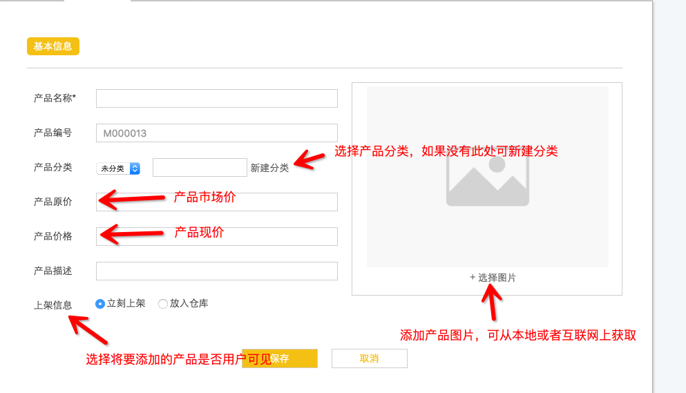 注意:帶“*”的為必填項,填完保存即可完成產品的添加