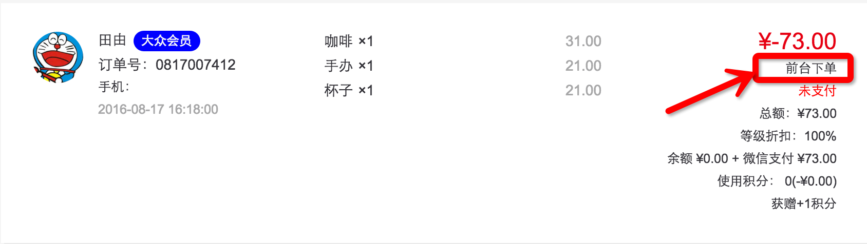 支付成功后后臺將會顯示該訂單信息,并標(biāo)注為前臺下單