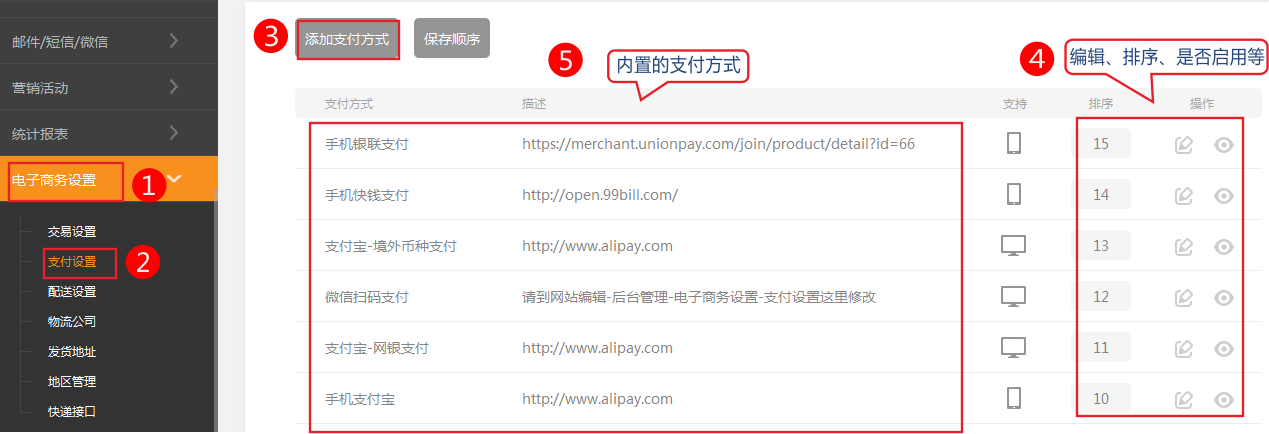 在線網(wǎng)關:也稱第三方支付網(wǎng)關,站長預先在支付網(wǎng)關平臺上申請帳號,審核通過后在后臺配置生效。當顧客也有相同的支付平臺帳號時,就可以選擇在線網(wǎng)關支付,跳轉(zhuǎn)到網(wǎng)關平臺付款完成后會返回一個狀態(tài)給網(wǎng)站,然后店主根據(jù)狀態(tài)情況來進行后續(xù)操作。因為有了第三方的保證,在線網(wǎng)關使用相對會更安全些。目前常用的在線網(wǎng)關有支付寶、財付通、快錢、paypal等。 依次點擊》電子商務設置-》支付設置,可以看到系統(tǒng)已經(jīng)內(nèi)置了一些常用的支付方式,再配置一下帳號就可以使用了。
