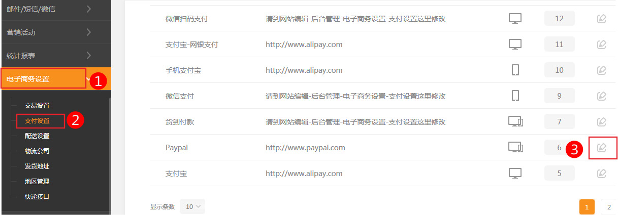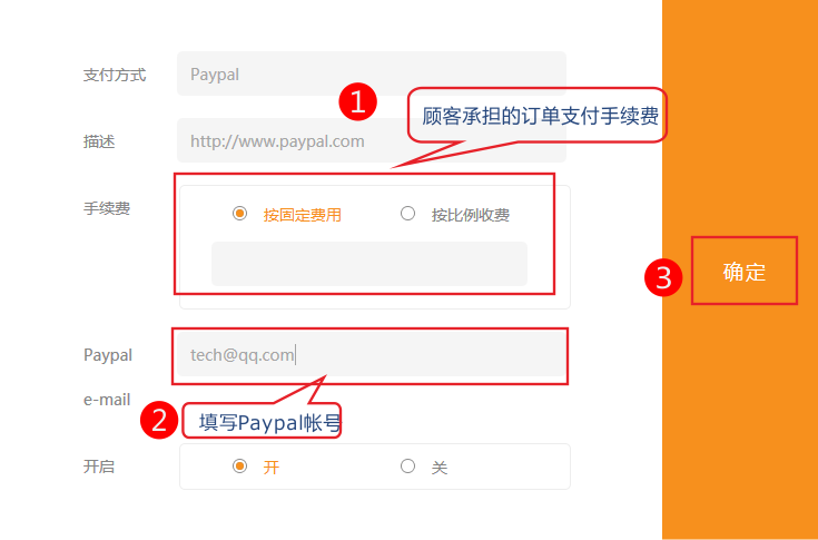 2、設置PAYPAL接口流程 1.依次 點擊 后臺管理-電子商務設置-支付設置-編輯貝寶 2.設置支付手續(xù)費,填寫paypal 帳號保存