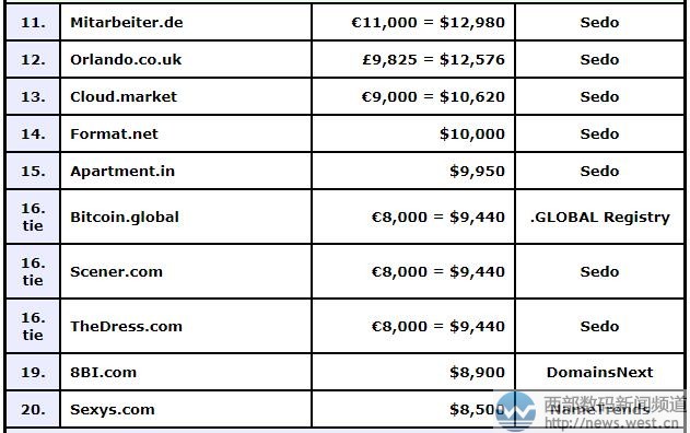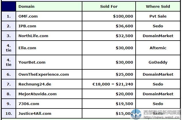金融終端66萬元收購域名OMF.COM!“比特幣”“云市場”均登DN榜西部數碼(west.cn)8月17日消息,本期 DN交易榜(8.14-8.20)上,三字母域名OMF.COM以100,000美元奪得第一,約合人民幣66萬元。