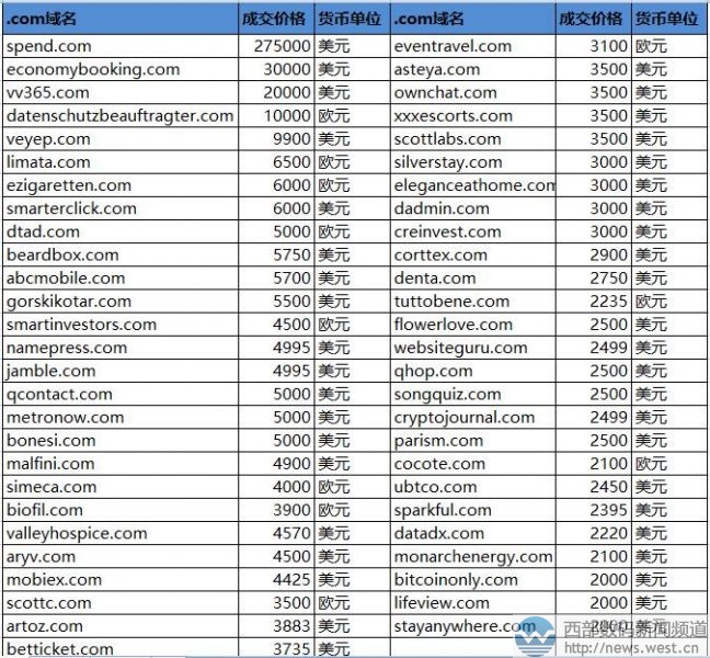 領(lǐng)跑sedo榜!英文域名spend.com拍出182萬元!西部數(shù)碼(west.cn)11月29日消息,據(jù)外媒消息,最新一期的sedo交易榜剛剛出爐。本期共有78個域名超2000美元成交,其中冠軍由雙拼域名spend.com以275,000美元摘得,約合人民幣182萬元。