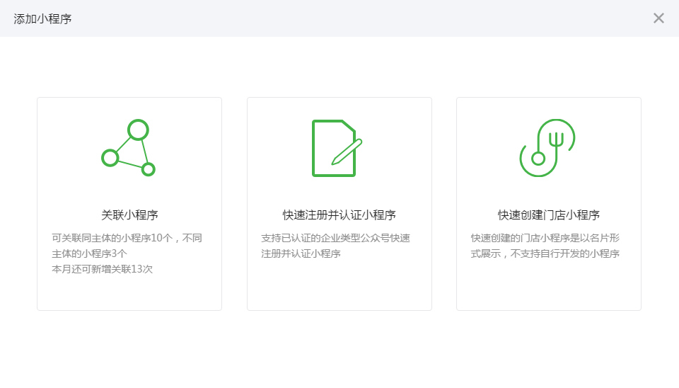 關(guān)聯(lián)規(guī)則: 所有公眾號都可以關(guān)聯(lián)小程序。 一個公眾號可關(guān)聯(lián)10個同主體的小程序,3個不同主體的小程序。 一個小程序可關(guān)聯(lián)3個公眾號。 公眾號一個月可新增關(guān)聯(lián)小程序13次,小程序一個月可新增關(guān)聯(lián)5次。