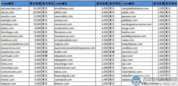 除此以外,.com域名方面成交價(jià)在五位數(shù)美元以上的還有netregie.com(潛在終端有IT公司Netregie)、softotpay.com(軟支付)、daten.com、blocktags.com(塊標(biāo)記符)。