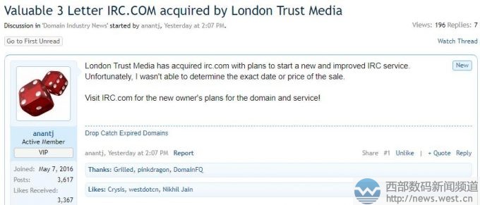 身價(jià)六位數(shù)美金?倫敦信托媒體收購(gòu)三字母域名IRC.com6月25日消息,據(jù)國(guó)外米友在Namepros上曝料稱,三字母域名IRC.com日前被英國(guó)媒體公司London Trust Media Holdings(倫敦信托媒體控股公司)收購(gòu)。外媒猜測(cè),域名IRC.com可能達(dá)六位數(shù)美金。