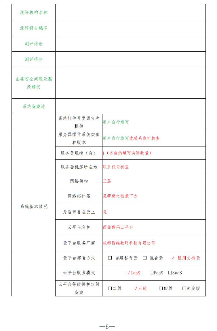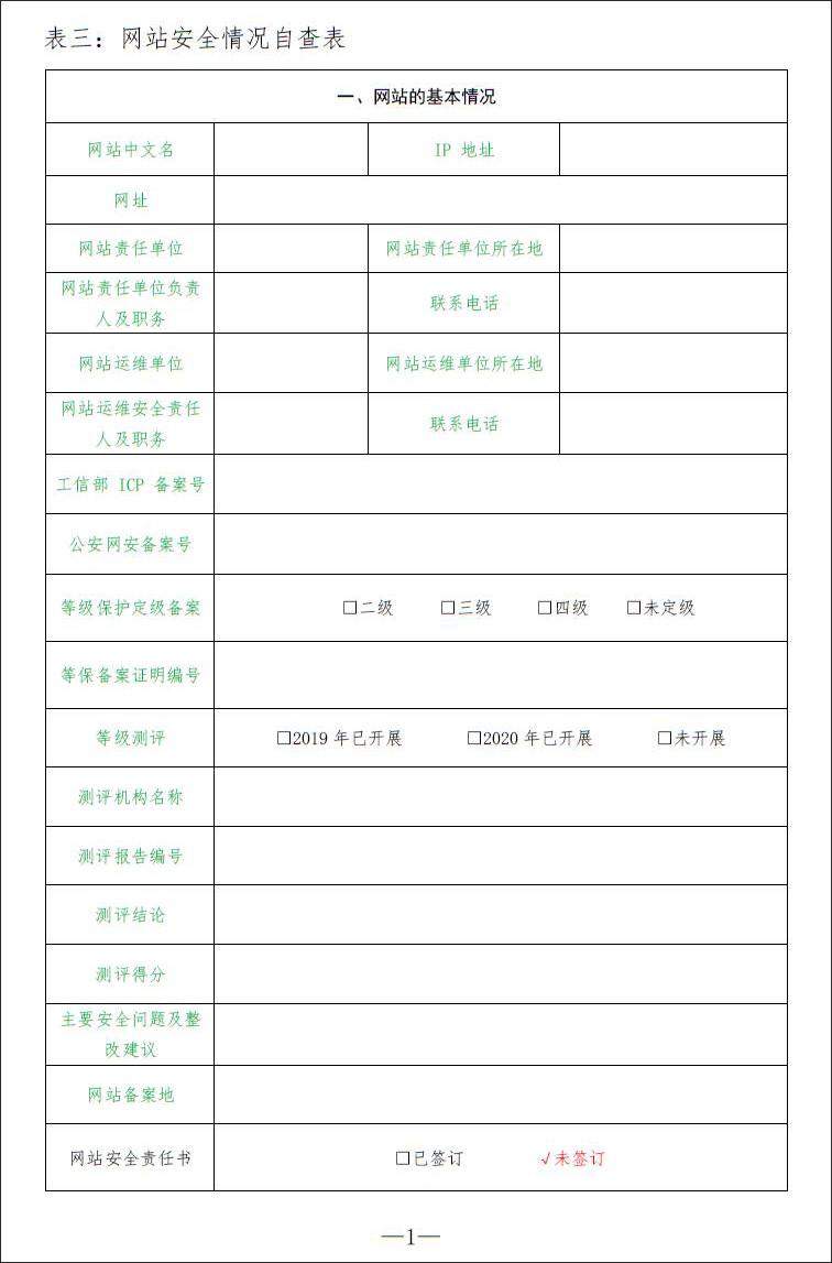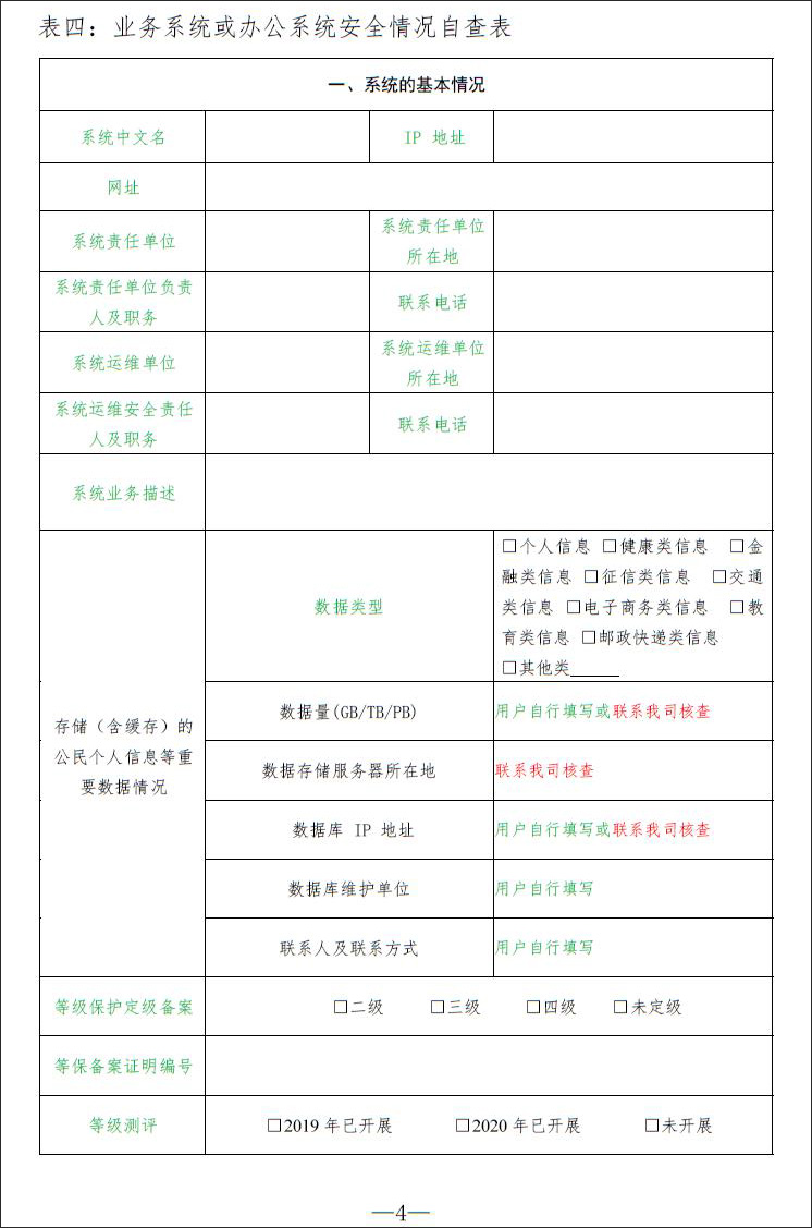 2020 年公安機(jī)關(guān)網(wǎng)絡(luò)安全監(jiān)督檢查自查表-填表說明此填表說明適用于《2020 年公安機(jī)關(guān)網(wǎng)絡(luò)安全監(jiān)督檢查自查表》紙質(zhì)版和《2020 年公安機(jī)關(guān)網(wǎng)絡(luò)安全監(jiān)督檢查自查采集工具》的填寫。 >>>填表說明: 1、如果您的單位不是行業(yè)主管部門或者網(wǎng)絡(luò)運(yùn)營(yíng)者,不用填寫“表一:行業(yè)主管部門填寫”和“表二:網(wǎng)絡(luò)運(yùn)營(yíng)者填寫”,直接選擇表三或表四填寫。 2、如果您使用的是虛擬主機(jī)請(qǐng)升級(jí)為云主機(jī),然后填寫。虛擬主機(jī)不適用于本表填寫。 3、圖中綠色的部分,需要用戶自行填寫,紅色的部分請(qǐng)參照頁(yè)面文字填寫,需聯(lián)系我司核實(shí)的信息請(qǐng)?zhí)砑游宜驹诰客服QQ 800019263 聯(lián)系售后咨詢或提交工單咨詢。