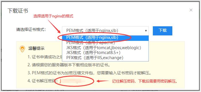3.選擇PEM格式,適合nginx的,然后點(diǎn)擊下載。因?yàn)橄螺d是rar的壓縮包,因此請(qǐng)記住解壓密碼,下載后需要用密碼進(jìn)行解壓。