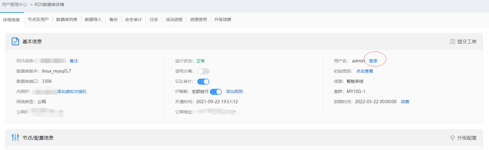 6.如何創(chuàng)建用戶訪問指定數(shù)據(jù)庫用admin賬戶登錄成功之后,使用語句 create user ‘test’@’%’ identified by ‘password’, 創(chuàng)建賬號,再用 grant 權(quán)限 on 指定數(shù)據(jù)庫名 .* to ‘test’@’%’ identified by ‘password’; 7.RDS開通并創(chuàng)建數(shù)據(jù)庫后,在程序中如何使用?程序中用戶是admin,密碼通過后臺獲取,連接地址使用內(nèi)網(wǎng)地址(如果有公網(wǎng)可以用公網(wǎng)地址,但建議建立邏輯私網(wǎng)參考4.2,用內(nèi)網(wǎng)地址訪問),端口用默認(rèn)的3306。密碼和內(nèi)網(wǎng)獲取如下圖。