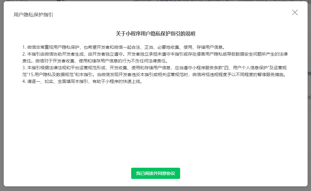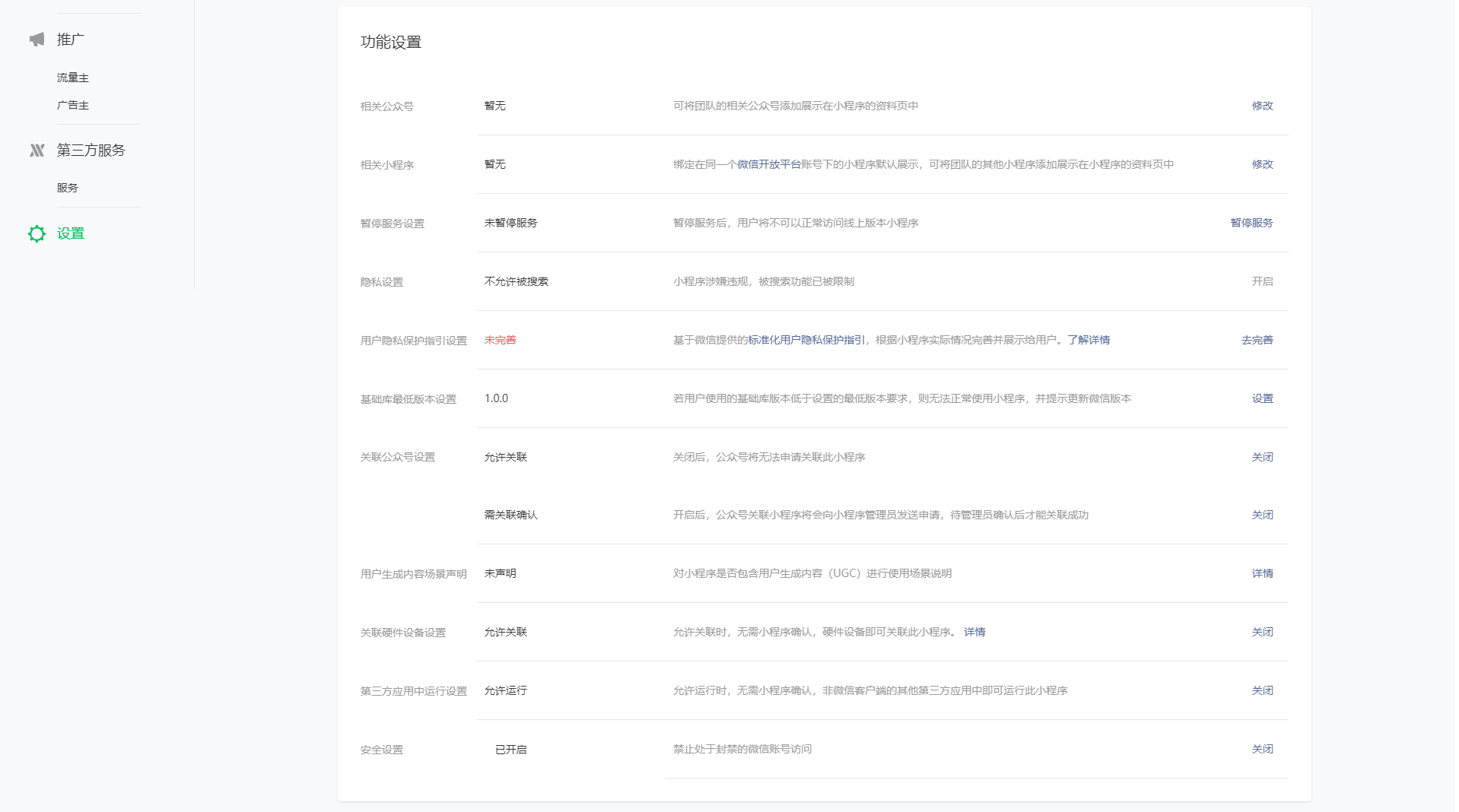 非代開發(fā)小程序用戶隱私保護配置非代開發(fā)小程序的用戶請登陸微信公眾平臺(https://mp.weixin.qq.com)在【小程序管理后臺-設(shè)置-功能設(shè)置-用戶隱私保護指引】自行配置 第一步:登錄小程序管理后臺在【設(shè)置-功能設(shè)置-用戶隱私保護指引】點擊【去完善】