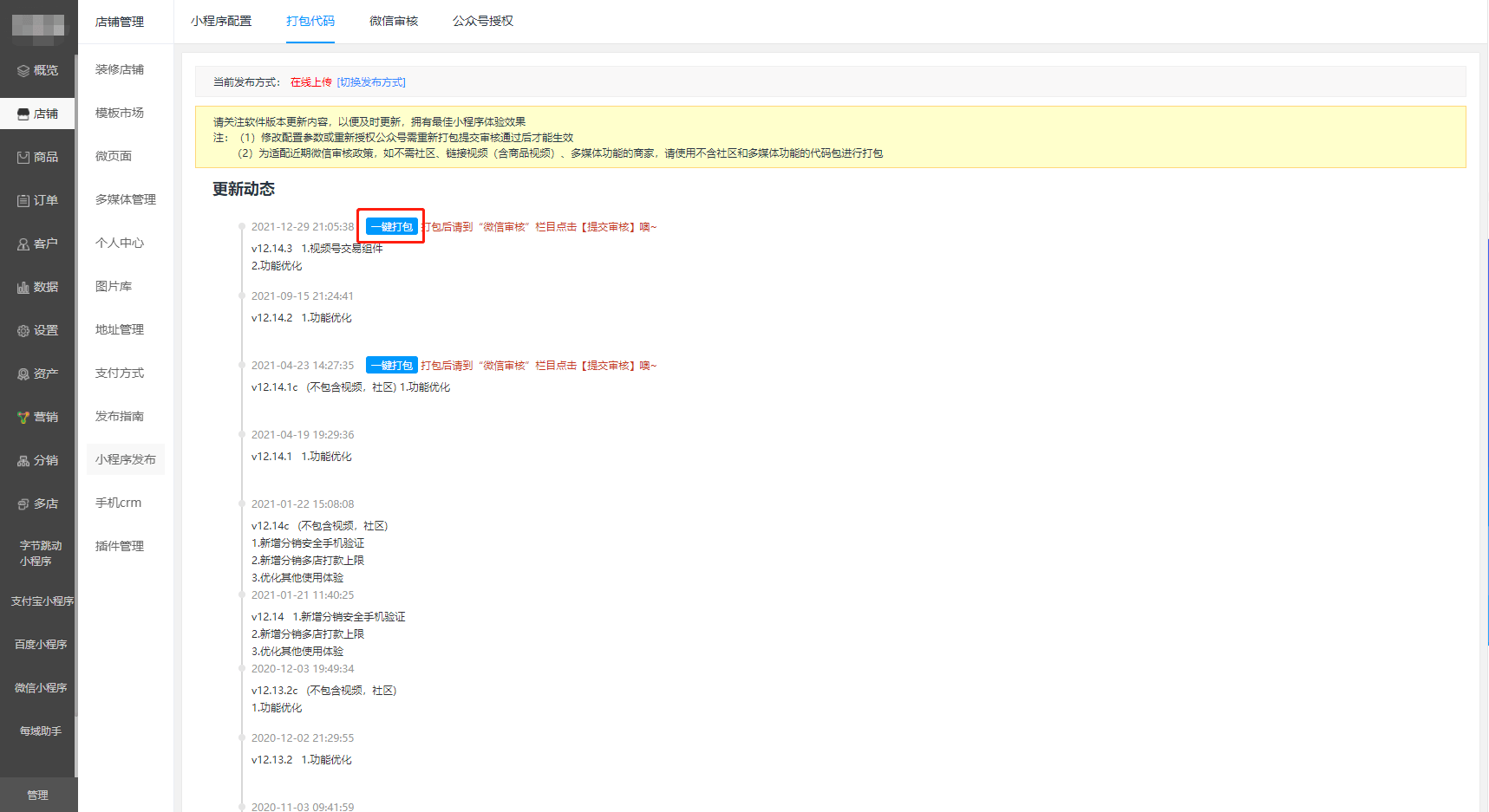 3、在后臺【店鋪-小程序發(fā)布-打包代碼】點擊【一鍵打包】