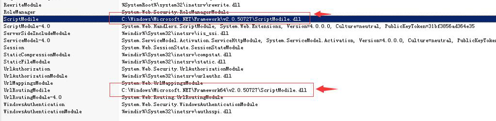經(jīng)查看站點設置等信息,發(fā)現(xiàn)iis站點》模塊被加入了異常dll,如圖