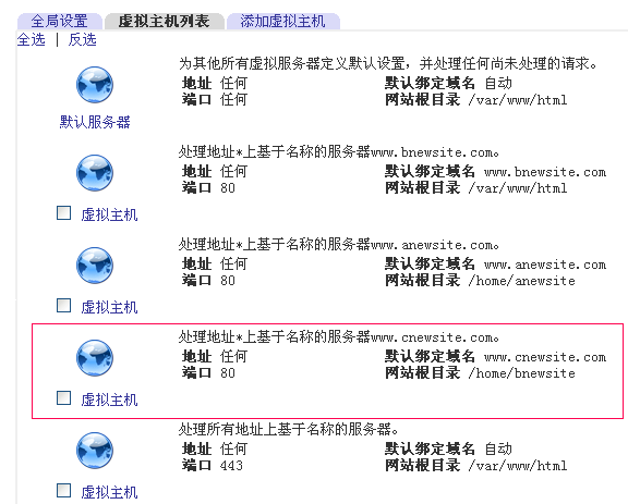 [原創(chuàng)]如何利用webmin在Linux主機(jī)中添加網(wǎng)站Linux系統(tǒng)因其高效穩(wěn)定而受到廣大用戶的推崇與青睞,然后其管理的復(fù)雜性也使很多用戶望而卻步,動(dòng)彈不得.為了降低 Linux系統(tǒng)的管理難度,更有效方便的使用該系統(tǒng),我司所有Linux主機(jī)或VPS系統(tǒng)均預(yù)裝了網(wǎng)頁(yè)管理工具webmin. 1、登錄系統(tǒng) ![]() 2、添加新網(wǎng)站 當(dāng)您準(zhǔn)備利用該Linux服務(wù)器發(fā)布某個(gè)網(wǎng)站時(shí),您首先應(yīng)該將網(wǎng)站的域名解析到服務(wù)器,并在服務(wù)器上添加相應(yīng)的配置才可使用.完成網(wǎng)站發(fā)布的程序叫Apache,所以我們添加新網(wǎng)站的過程也就是Apache服務(wù)的管理過程. 當(dāng)然,一個(gè)完整的網(wǎng)站通常包括一個(gè)上傳用的FTP,一個(gè)網(wǎng)站以及一個(gè)MySQL數(shù)據(jù)庫(kù).此三者需要分別添加,具體詳情如下: 2.1 添加FTP帳號(hào) Linux系統(tǒng)中FTP帳號(hào)通常也就是系統(tǒng)帳號(hào),利用webmin添加的過程如下: 登錄webmin后,點(diǎn)擊"系統(tǒng)"-"用戶與群組"(如下圖) ![]() 再點(diǎn)擊"創(chuàng)建新用戶"(如下圖) ![]() 在"創(chuàng)建新用戶"表單中,輸入"用戶名",口令那兒選擇"明文口令"并輸入密碼即可,所有其它選項(xiàng)全部默認(rèn),并點(diǎn)新建即可.該用戶名與密碼即是FTP上傳用戶名與密碼.(如下圖) ![]() 2.2 添加網(wǎng)站 Linux下的網(wǎng)站服務(wù)是由Apache軟件來提供的,所以我們需要在webmin中點(diǎn)擊"服務(wù)器"-"Apache 服務(wù)器"(如下圖) ![]() 點(diǎn)擊后系統(tǒng)會(huì)列出現(xiàn)有的所有虛擬主機(jī),此時(shí)我們需要點(diǎn)擊"添加虛擬主機(jī)"(如下圖) ![]() "服務(wù)器IP地址"選擇"任意地址" "端口"指定為"80" "網(wǎng)站根目錄"設(shè)置為步驟2.1所添加的系統(tǒng)帳號(hào)的主目錄,默認(rèn)情況下路徑是/home/FTP用戶名,可點(diǎn)擊后邊的"..."按鈕瀏覽選擇 "默認(rèn)綁定域名"填寫為您的主域名,若有多個(gè)域名,則剩下的域名需要添加好虛擬主機(jī)后再行設(shè)置. 最后點(diǎn)擊"確定添加"即可(如下圖) ![]() 2.3 增加新的綁定域名 添加虛擬主機(jī)默認(rèn)只能指定一個(gè)域名,若您一個(gè)網(wǎng)站有多個(gè)域名需要綁定時(shí),需添加好網(wǎng)站后按以下步驟操作. 首先重新進(jìn)入"Apache 服務(wù)器"管理,選中剛才添加的虛擬主機(jī),點(diǎn)擊剛才添加的虛擬主機(jī)前邊的地球圖標(biāo)(如下圖) ![]() 再點(diǎn)擊"網(wǎng)絡(luò)和地址"(如下圖) ![]() 在"替代的虛擬服務(wù)器名"中將剩下的域名填寫進(jìn)去并點(diǎn)保存即可,每行一個(gè).(如下圖) ![]() ****特別注意**** 不管是添加虛擬主機(jī)還是新增綁定域名,保存后并不會(huì)立即生效,必須點(diǎn)擊右上方的"保存修改"后方可生效(如下圖) ![]() 3、新加MySql數(shù)據(jù)庫(kù) 一般PHP網(wǎng)站都會(huì)使用一到兩個(gè)MySQL數(shù)據(jù)庫(kù),一個(gè)完整的可使用的數(shù)據(jù)庫(kù)實(shí)際上由三部分組成:①數(shù)據(jù)庫(kù)本身,②登錄MySQL系統(tǒng)的用戶,③用戶與數(shù)據(jù)庫(kù)之間的關(guān)系。 所以若要使用Webmin添加一個(gè)MySql數(shù)據(jù)庫(kù),需要經(jīng)過三個(gè)步驟. 3.1添加數(shù)據(jù)庫(kù) 點(diǎn)擊Webmin的"服務(wù)器"-"MySQL數(shù)據(jù)庫(kù)服務(wù)器"(如下圖) ![]() 再點(diǎn)擊"創(chuàng)建新的數(shù)據(jù)庫(kù)"(如下圖) ![]() 在"創(chuàng)建新的數(shù)據(jù)庫(kù)"表單中,僅輸入"數(shù)據(jù)庫(kù)名"即可,不用修改其它任何設(shè)置并點(diǎn)"新建"即可,一般推薦數(shù)據(jù)庫(kù)名和您的上傳用戶名相同,方便識(shí)別(如下圖) ![]() 3.2添加數(shù)據(jù)庫(kù)登錄用戶 在"Mysql數(shù)據(jù)庫(kù)服務(wù)器"中點(diǎn)擊"用戶權(quán)限"(如下圖) ![]() 再點(diǎn)擊"創(chuàng)建新用戶"(如下圖) ![]() 在"創(chuàng)建新用戶"表單中 "用戶名"填寫登錄名,一般推薦與數(shù)據(jù)庫(kù)名相同 "密碼"設(shè)置為數(shù)據(jù)庫(kù)登錄密碼 "主機(jī)"默認(rèn)"任何"即可 "權(quán)限"不要選擇,默認(rèn)即可 并點(diǎn)擊"新建"(如下圖) ![]() 3.3建立添加的用戶與數(shù)據(jù)庫(kù)之間的關(guān)系 在"Mysql數(shù)據(jù)庫(kù)服務(wù)器"中點(diǎn)擊"數(shù)據(jù)庫(kù)權(quán)限"(如下圖) ![]() 再點(diǎn)擊"創(chuàng)建新的數(shù)據(jù)庫(kù)權(quán)限"(如下圖) ![]() 在"創(chuàng)建數(shù)據(jù)庫(kù)權(quán)限"表單中 "數(shù)據(jù)庫(kù)"選擇(Selected)剛才新建的數(shù)據(jù)庫(kù)名 "用戶名"指定為剛才新建的MySQL用戶 "主機(jī)"默認(rèn)選擇"任何" "權(quán)限"選擇好除"授予特權(quán)"外的所有權(quán)限 并點(diǎn)擊"新建"即可(如下圖) ![]() 2010年7月5日起開通的部分linux VPS , 我司已為您建了一個(gè)默認(rèn)的虛擬主機(jī): ftp賬號(hào)vhost001 上傳密碼mypassword001 上傳后,將您的域名解析到IP,域名提交白名單,生效后就可以訪問。 經(jīng)過以上步驟,一個(gè)完整的Linux下的網(wǎng)站空間即建立成功,當(dāng)然部分PHP程序要求空間中的一些目錄必須具備寫權(quán)限,此時(shí)使用Webmin中的"其它"-"文件管理器"功能中的"信息"功能將該目錄的組及其它用戶的寫入權(quán)限選中即可.(文件管理器是一個(gè)JAVA小程序,使用過程是先選中該
