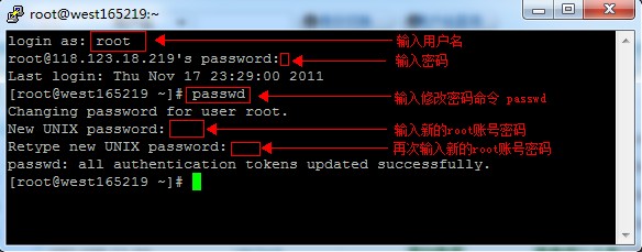 修改root密碼流程: 輸入賬號(hào)root,輸入密碼,登陸到linux。 輸入修改密碼的命令 passwd 根據(jù)提示輸入新密碼,輸入新密碼的時(shí)候,軟件不會(huì)顯示*號(hào),輸入后回車就行了。如下圖: 修改完密碼后,先不要關(guān)閉客戶端,新開一個(gè)客戶端,用新密碼登陸測試是否修改成功,修改成功后再關(guān)閉客戶端。 (注意:若您使用的是webmin的管理平臺(tái),登陸webmin的root密碼也將一起被修改)