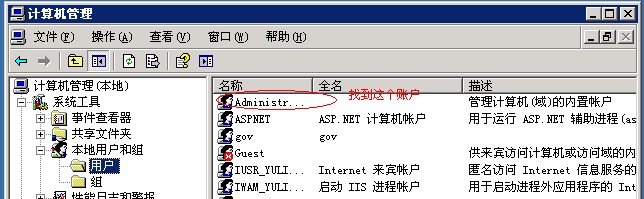 2008系統(tǒng) 右鍵我的電腦--管理 進(jìn)入后在配置-本地用戶和組-用戶,在右側(cè)找到administrator帳戶:
