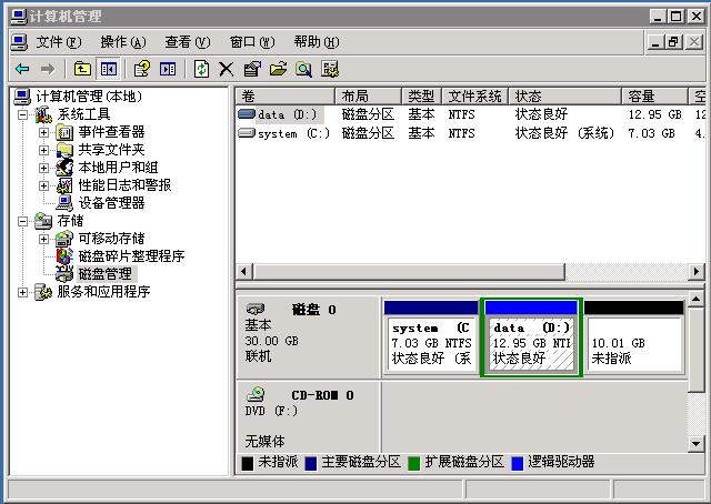 依圖所示 這個(gè)是我們從20G升級(jí)到了30G的硬盤(pán),我們要做的就是將D盤(pán)擴(kuò)大,這個(gè)我們需要用到一個(gè)磁盤(pán)工具,這里我們推薦的是“Paragon Partition Manager Server 10”,您可以直接從http://download.west263.net/tools/ppm10s.rar 下載到桌面,解壓后,執(zhí)行 運(yùn)行.bat 現(xiàn)在我們開(kāi)始擴(kuò)展D盤(pán) 1、擴(kuò)大邏輯分區(qū)