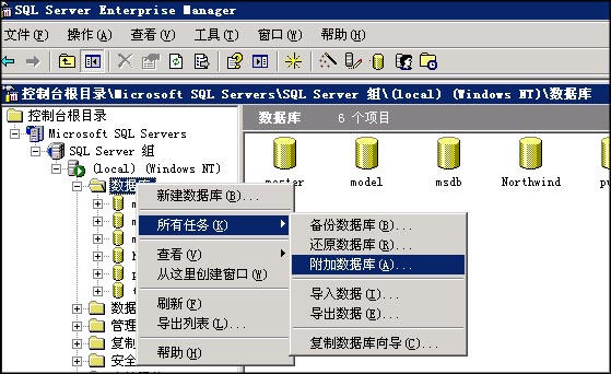 2、點(diǎn)擊“數(shù)據(jù)庫”--“所有任務(wù)”--“附加數(shù)據(jù)庫”,如圖:
