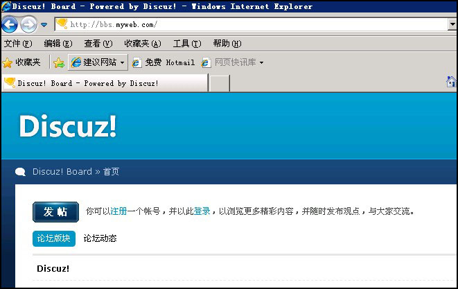 至此新建子站的過程就結束,可以用您的子站域名如:bbs.myweb.com來訪問測試下,如圖: