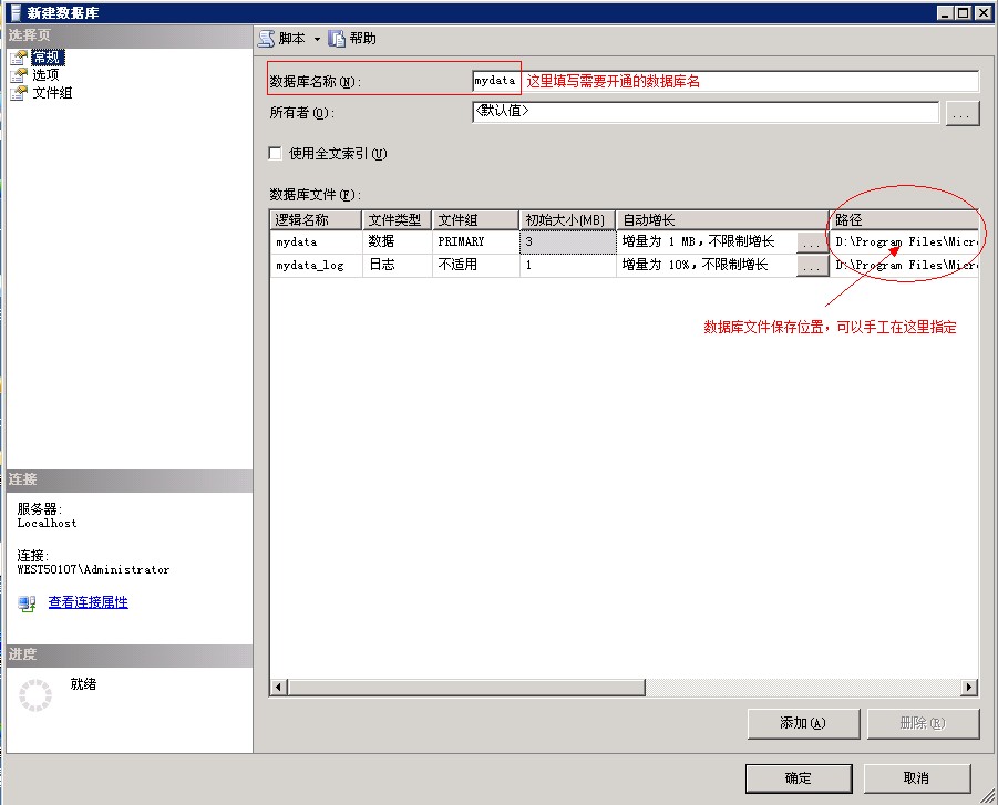 填寫數(shù)據(jù)庫名,如mydata,選擇數(shù)據(jù)庫保存路徑,一般可以保持默認(rèn)地址,點(diǎn)擊“確定”。