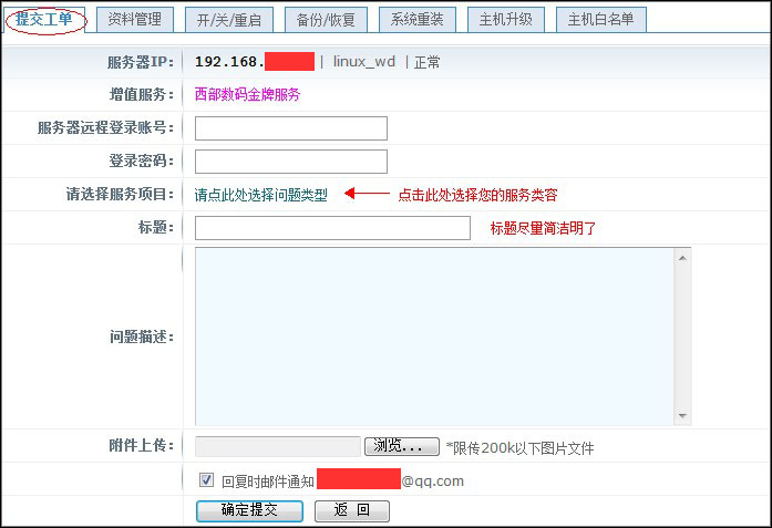 選擇需要維護(hù)的服務(wù)器,點(diǎn)對(duì)應(yīng)的工單按鈕提交工單,選擇您的問題類別,并提交詳細(xì)問題,就可以了,如圖: