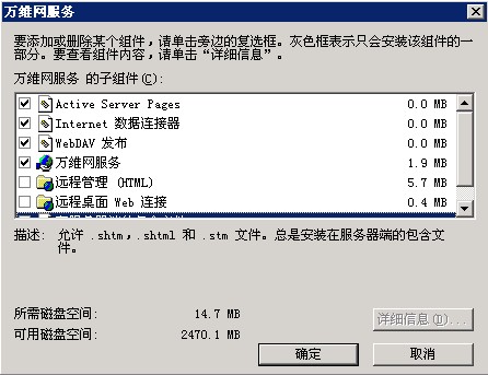 6、勾選“Active Server Pages”、“Internet 數(shù)據(jù)連接器”、“WebDAV 發(fā)布 ”、“在服務(wù)器端的包含文件”,然后一路點(diǎn)“確定”,最后點(diǎn)“下一步”開始安裝,如圖: