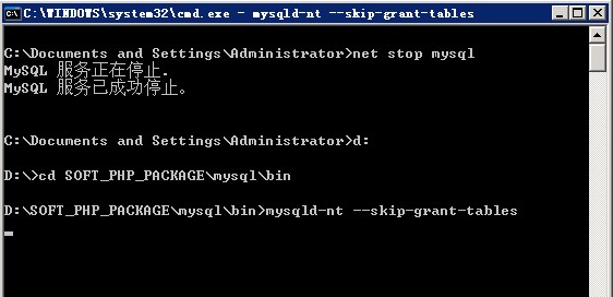 windows/linux 命令行方式重置mysql的root密碼Windows環(huán)境的找回方法: 1、打開cmd命令窗口,先輸入命令: net stop mysql 回車 #關(guān)閉mysql服務(wù)。 進(jìn)入到D:\SOFT_PHP_PACKAGE\mysql\bin\ 目錄下,執(zhí)行mysqld --skip-grant-tables 啟動(dòng)MySQL Server (如果報(bào)錯(cuò),執(zhí)行mysqld-nt --skip-grant-tables)如圖: