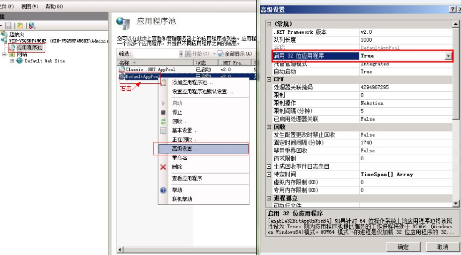 如上圖選中 應(yīng)用程序池--找到相應(yīng)的程序池,右擊--高級設(shè)置--將‘啟用32位應(yīng)用程序’ 設(shè)置為 True (這個非常重要不然PHP無法正常執(zhí)行)再訪問正常了。 以上是對IIS里面的所有站點全局設(shè)置腳本映射,可對單獨的站點設(shè)置設(shè)置方法和上面一樣。 2、FTP 設(shè)置 FTP數(shù)據(jù)是保存在注冊表里面的,腳本在win2003系統(tǒng)里面默認(rèn)會配置好,在WIN2008里面安裝后默認(rèn)權(quán)限是不正確的需要手動設(shè)置,在注冊表里面找到 HKEY_LOCAL_MACHINE\SOFTWARE\Wow6432Node\Cat Soft 將Cat Soft及其子目錄設(shè)置為servu用戶完全控制即可。