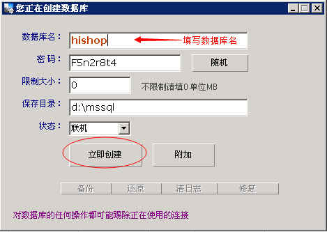2.輸入mssql數(shù)據(jù)庫名,不可與已創(chuàng)建的其他數(shù)據(jù)庫重名,密碼為了保證復(fù)雜性,可以使用系統(tǒng)自動生成的密碼,不做修改。然后點“立即創(chuàng)建”即可。