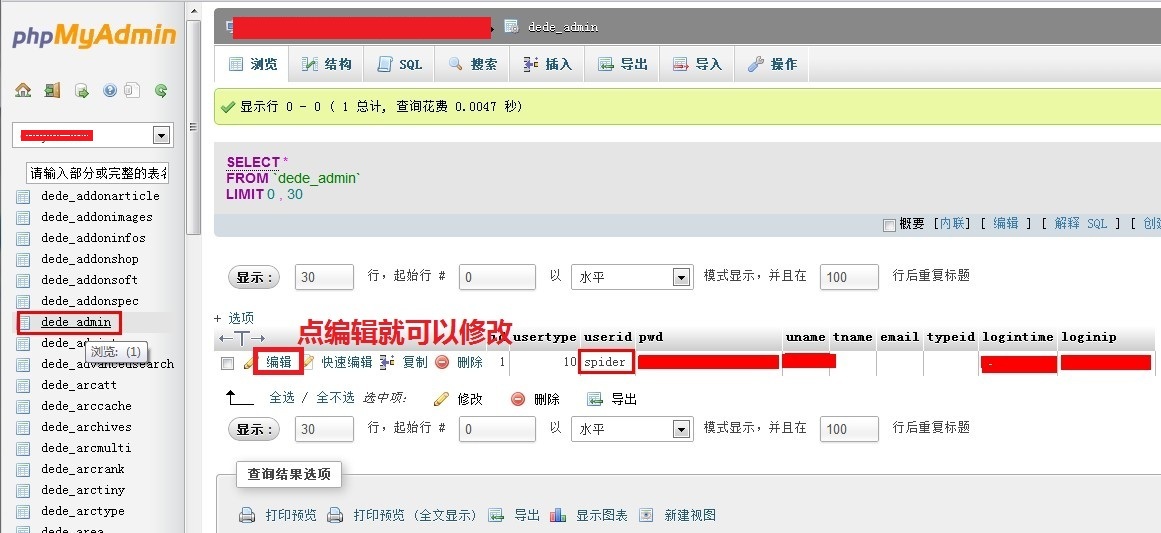登陸以后查看dede_admin表里面的用戶是否被篡改為spider 點(diǎn)擊編輯,直接將spider修改為您需要的管理員,pwd替換為962ac59075b964b07152,這個(gè)密碼是123,更改以后請及時(shí)登陸網(wǎng)站后臺進(jìn)行修改密碼。