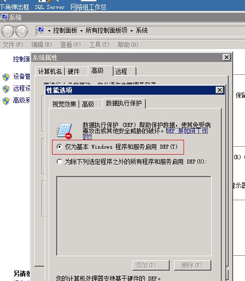 可能的原因有二種: 1.C:\Windows\Temp 目錄不能寫入緩存造成異常; 解決辦法:(1).刪除C:\Windows\Temp下所有文件,并且確定everyone完全控制此目錄。 (2).我的電腦/計算機”--屬性,高級-環(huán)境變量,TEMP改成d:\tmp,注意建立對應(yīng)文件夾,并且給everyone完全控制權(quán)限。如果是更改TEMP需要重啟服務(wù)器才生效。 補充:C:\Documents and Settings\Administrator\Local Settings\Temp 也要檢查,是否有相應(yīng)控制權(quán)限 cmd下運行: cacls "C:\Documents and Settings\Administrator\Local Settings\Temp" /T /e /g administrator:f cacls "C:\Documents and Settings\Administrator\Local Settings\Temp" /T /e /g everyone:f 2.可能是開啟數(shù)據(jù)保護原因造成。 解決: 3.D盤空間占滿,會報錯:本地數(shù)據(jù)庫無法使用,本次操作會受影響