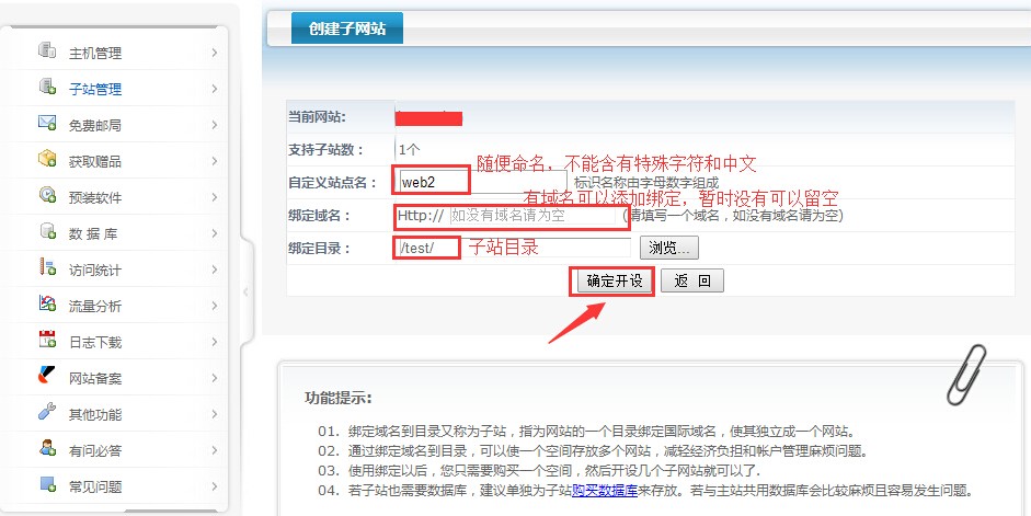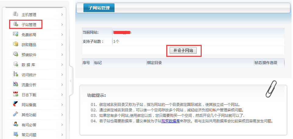 開設成功以后將文件上傳到子站目錄。 獨立控制面板開設位置: