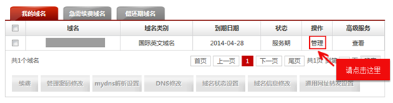 2、在域名管理頁面找到要修改DNS的域名,點(diǎn)擊【管理】 3、打開頁面后,點(diǎn)擊【域名管理】