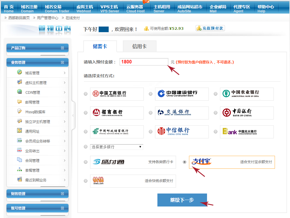 1. 進(jìn)入在線支付中心,輸入支付金額,并選擇支付寶接口進(jìn)行支付!如下圖所示!
