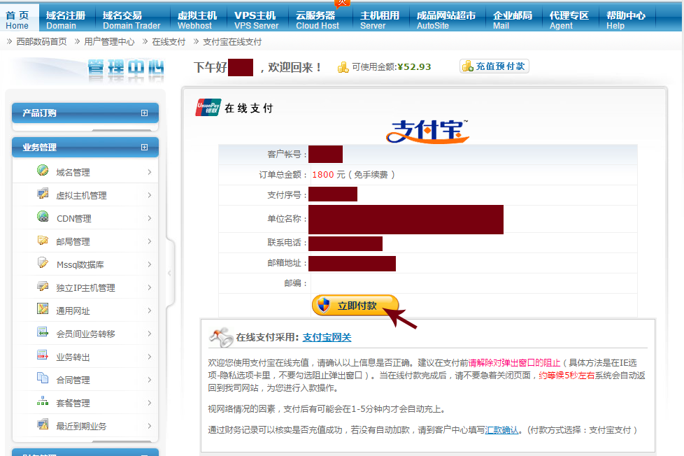 2. 確認(rèn)訂單,并立即支付!如下圖所示!