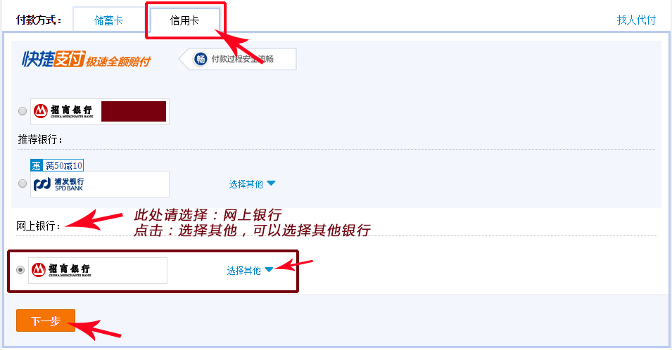 4. 選擇信用卡選項(xiàng),選擇網(wǎng)上銀行,并選擇對(duì)應(yīng)的銀行!如下圖所示!
