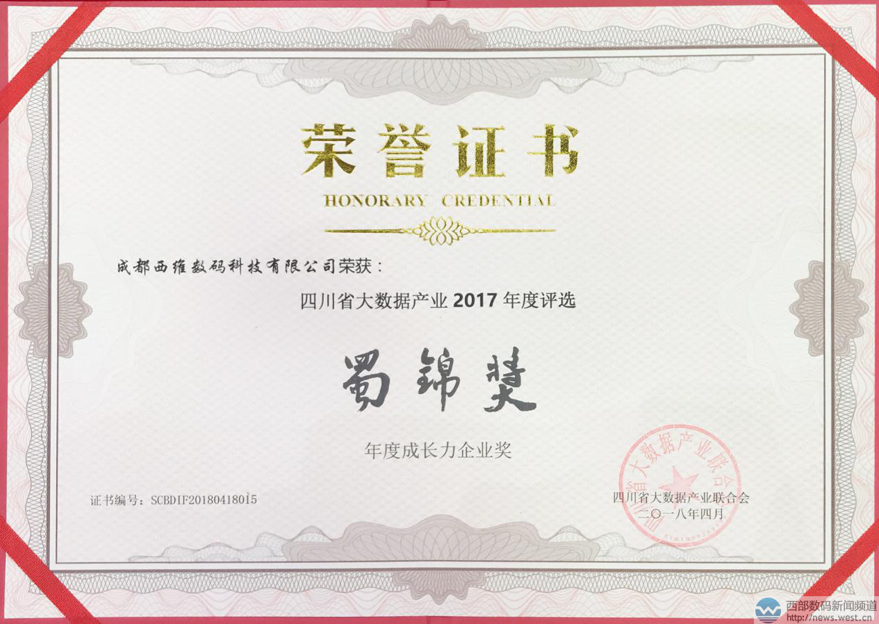 圖:四川省大數(shù)據(jù)產(chǎn)業(yè)2017年度“蜀錦獎” 西部數(shù)碼獲獎證書