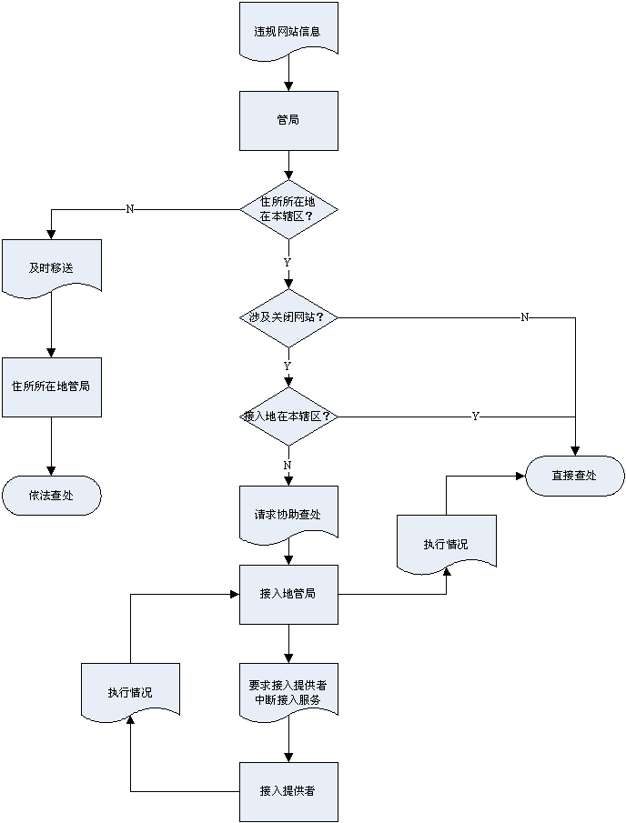 (五)網(wǎng)站接入地不在本行政區(qū)的,省通信管理局可以直接發(fā)函要求接入地省通信管理局配合關(guān)閉網(wǎng)站,接入地省通信管理局應(yīng)積極予以配合,及時(shí)書面通知相關(guān)接入提供者停止接入,并將執(zhí)行情況反饋網(wǎng)站主辦者住所所在地省通信管理局。