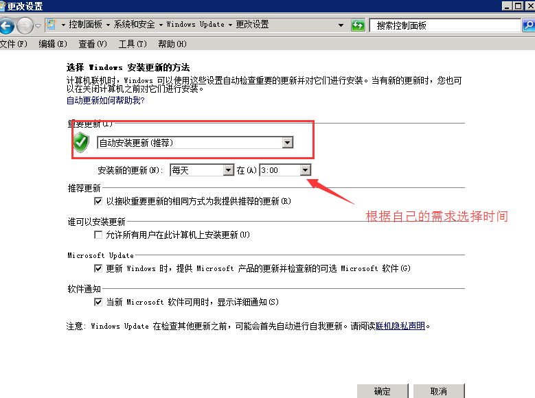 三、開啟自動更新 有些服務(wù)器可能沒有設(shè)置自動更新,處于安全考慮建議開啟,設(shè)置方法: 點桌面上“我的電腦”》右鍵屬性》Windows Update》,然后點“更改設(shè)置”,選擇“自動安裝更新”,所有值默認(rèn),如果有其他特殊需求可以更改,如下圖所示: