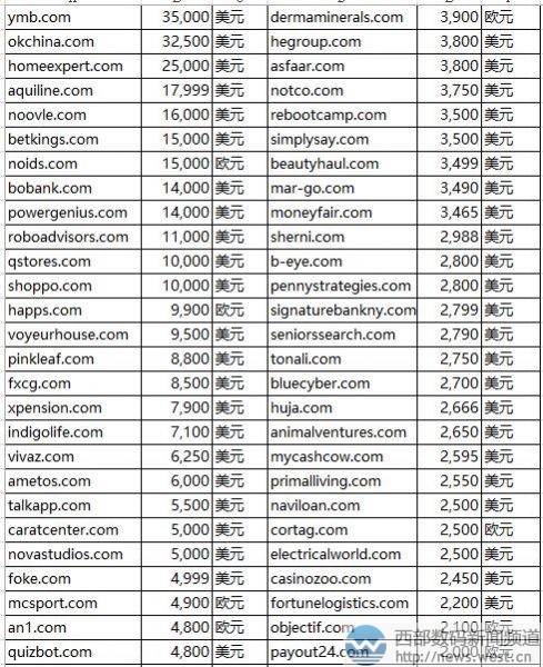 .com域名方面,本期超五位數(shù)美元成交的域名共有12個(gè),其中三聲母域名ymb.com結(jié)拍價(jià)最高。該域名注冊(cè)于1996年9月,距今已超過(guò)20年歷史了。含義上,有“域名吧、玉米棒、亞麻布、羊毛被、韻母表、移民寶、易秒寶、益民寶”等諸多詞語(yǔ),適合搭建域名、農(nóng)業(yè)、電商、移民等做個(gè)行業(yè)終端,應(yīng)用空間較大。 排在第二的是組合域名okchina.com,成交價(jià)為32,000美元,約合人民幣22萬(wàn)元!癱hina”一詞既有“中國(guó)”之意,又有“陶瓷”的意思,所以okchina.com適合搭建國(guó)家形象網(wǎng)站、旅游平臺(tái),也可搭建陶瓷類終端。 隨后是以25000美元成交的組合域名homeexpert.com,約合人民幣17萬(wàn)元,直譯為“家庭專家、置業(yè)專家”。搜索發(fā)現(xiàn),目前以“home expert”命名的終端不在少數(shù),homeexpert.com可廣泛用來(lái)搭建房租租賃、家庭糾紛解決平臺(tái)、個(gè)人健康管理網(wǎng)站等。 除此以外,aquiline.com以17,999美元結(jié)拍,在英文中有“鷹的,鷹鉤狀的”之意。緊隨其后的是英文域名noovle.com,結(jié)拍價(jià)為16000美元,該域名對(duì)應(yīng)了谷歌的合作伙伴——云解決方案服務(wù)商N(yùn)oovle,其官網(wǎng)啟用域名noovle.it。另外,betkings.com(賭王)、noids.com(有妄想癥的人)、bobank.com(BO銀行)、powergenius.com(能量天才)均五位數(shù)美元成交。