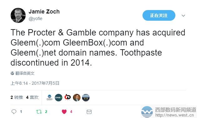 寶潔公司收購整套gleem相關(guān)域名!格利姆牙膏欲重出江湖?西部數(shù)碼(west.cn)7月6日消息,據(jù)知名投資人Jamie Zoach曝料稱,全球最大的日用消費品公司——寶潔,近日一舉收購了gleem.com/.net以及gleembox.com三枚域名。有意思的是,gleem.com對應(yīng)的寶潔旗下牙膏品牌,早在2014年便被寶潔公司放棄了。