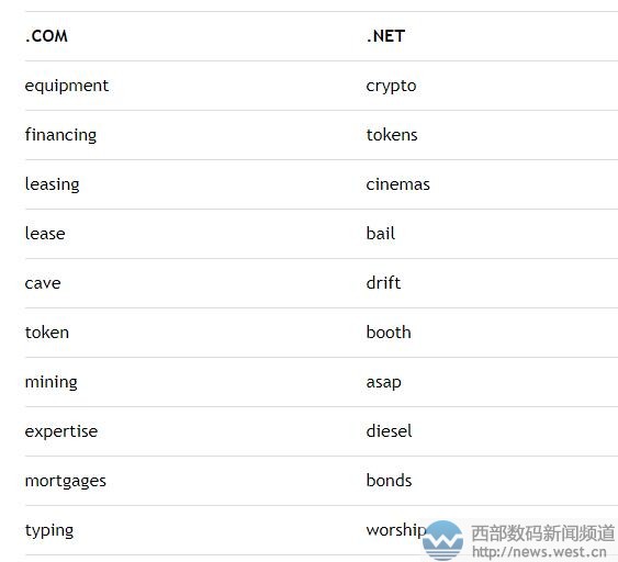 .com方面,“equipment”(設(shè)備,器材、配件)力壓眾多關(guān)鍵詞一舉成為最受歡迎的.com域名注冊詞匯。Equipment除了對應(yīng)有知名法國服飾品牌以外,本身還可以與多個行業(yè)多諸多詞語組合,可應(yīng)用的領(lǐng)域非常廣。 隨后是“financing”(融資、理財),作為一個金融類詞語,與此相關(guān)的域名可用來搭建投資理財?shù)冉K端平臺。同樣屬于金融行業(yè)詞的還有 “mortages”(抵押貸款),相關(guān)域名用來搭建抵押借貸平臺比較合適。 另外,兩個有著“租賃”之意的詞語“l(fā)easing”和“l(fā)ease”也成為6月份的注冊熱詞,可用于汽車、房產(chǎn)等多個行業(yè)租賃平臺。除此以外,“token”(代幣)、“mining”(采礦)、“cave”(洞穴)、“typing”(打字)均成為6月熱門注冊詞匯。 .net方面,兩個虛擬貨幣類詞語“crypto”(加密貨幣)、“token”(代幣)是6月最受歡迎的注冊詞匯。今年以來,虛擬貨幣行業(yè)的瘋狂發(fā)展,不僅使得相關(guān)域名成交價水漲船高,也催生了大批域名淵源不斷的被注冊。 隨后,“cinemas”(電影院)一詞在本月注冊量也極大,近年來,全球影視市場風起云涌,不少大佬紛紛進軍電影領(lǐng)域,加上今年大片不斷,“電影院”人氣高漲。 除此以外,“bail”(保釋金)、“drift”(漂泊)、“booth”(售貨棚)等詞也榜上有名。 本文轉(zhuǎn)載自新聞資訊,原文鏈接:威瑞信6月月報:虛擬貨幣熱度不減!“crypto”再成最受歡迎域名關(guān)鍵詞