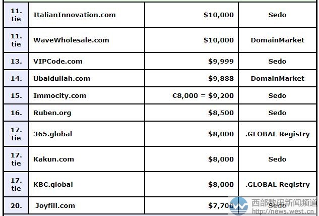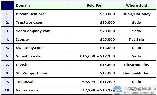 DN榜:比特幣風(fēng)頭太盛!3月注冊(cè)的域名bitcoincash.org賣出 6位數(shù)!西部數(shù)碼(west.cn)7月20日消息,本期的DN交易榜(7.10-7.16)上,.com域名不再完全占據(jù)榜單,而是出現(xiàn)國別域名、新頂級(jí)域名、其他域名百花齊放的態(tài)勢(shì)。比如,本期奪得DN冠軍的便是域名bitcoincash.org,成交價(jià)為48,888美元,約合人民幣33萬元。