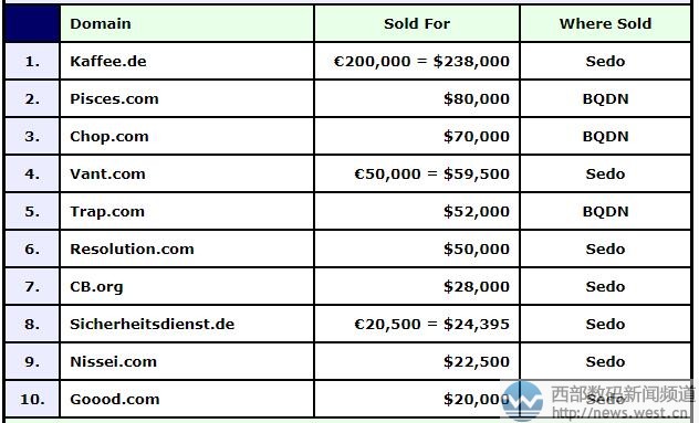 DN榜:“咖啡”域名kaffee.de成目前為止今年最貴國(guó)別域名!西部數(shù)碼(west.cn)9月18日消息,本期 DN交易榜(9.4-9.10)上,國(guó)別域名異常搶眼,其中德國(guó)域名Kaffee.de以238,000美元在sedo平臺(tái)結(jié)拍,約合人民幣156萬(wàn)。該域名不僅是本期DN幫上成交價(jià)最高的域名,也是今年目前為止賣價(jià)最高的國(guó)別域名。